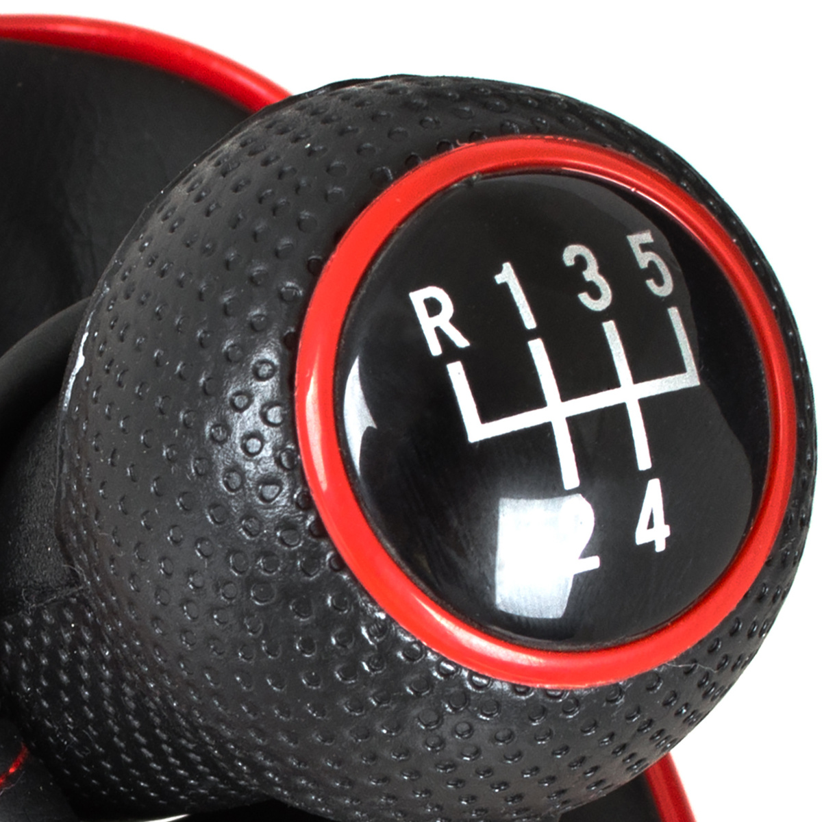 Kolor: mieszek czarny z czerwoną ramką, gałka czarna, nakładka czarna z czerwonym pierścieniem i białym schematem 5 biegów + R