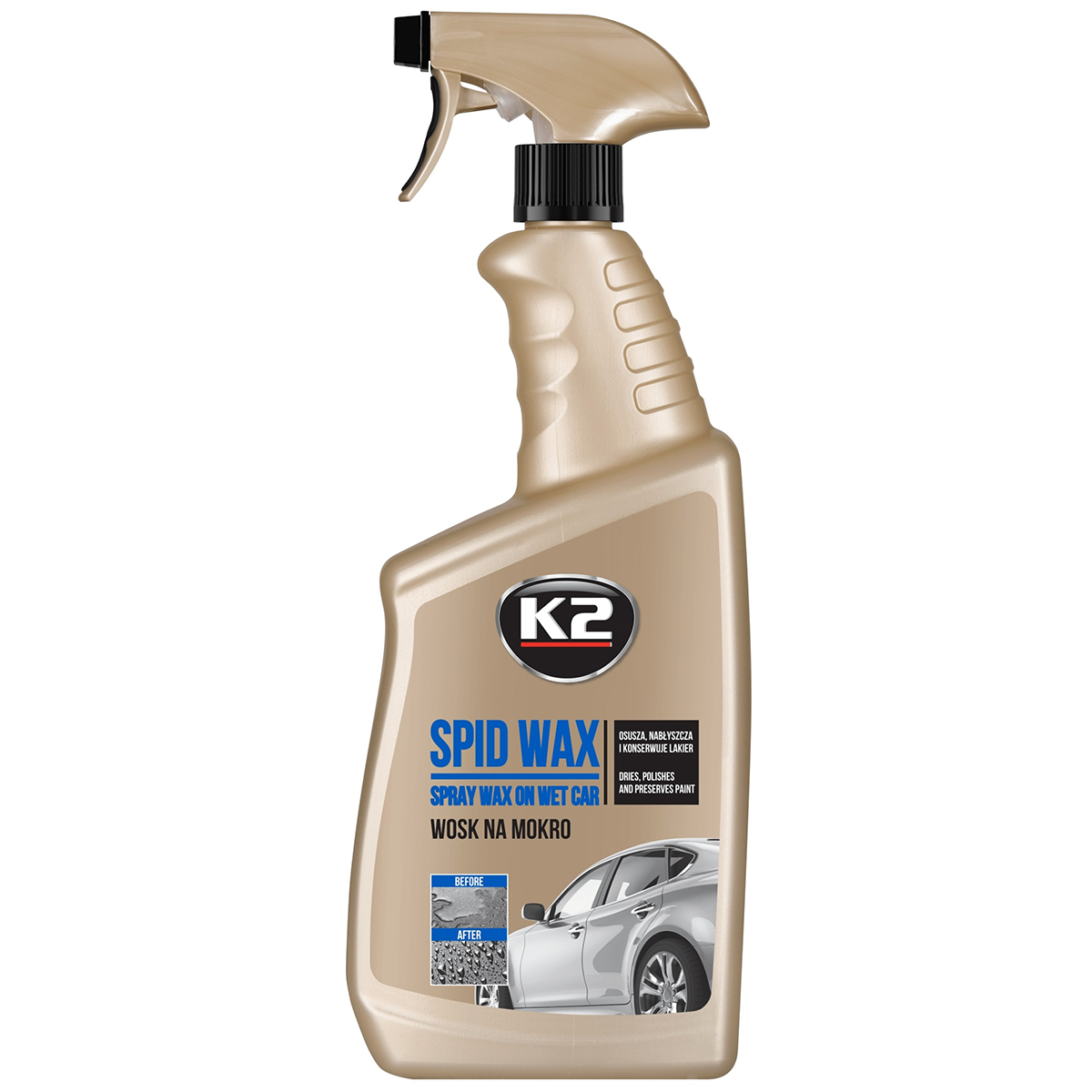 K2 Spid Wax jest to syntetyczny wosk osuszający, który służy do osuszania oraz zabezpieczenia lakieru. Nałożony na umytą karoserię Powoduje, że na lakierze powstaje cienka warstwa hydrofobowa, która odpycha wodę i powoduje jej spływanie – efekt samoosuszania lakieru. Przywraca naturalną barwę i połysk lakieru. K2 Spid Wax jest woskiem w sprayu, przez co jego aplikacja nie wymaga wysiłku. Jest alternatywą dla tradycyjnego osuszania za pomocą ręcznika z mikrofibry czy ściągaczki do wody. Zabezpiecza lakier przed działaniem czynników atmosferycznych. Po użyciu K2 Spid Wax woskowanie nie jest już potrzebne.